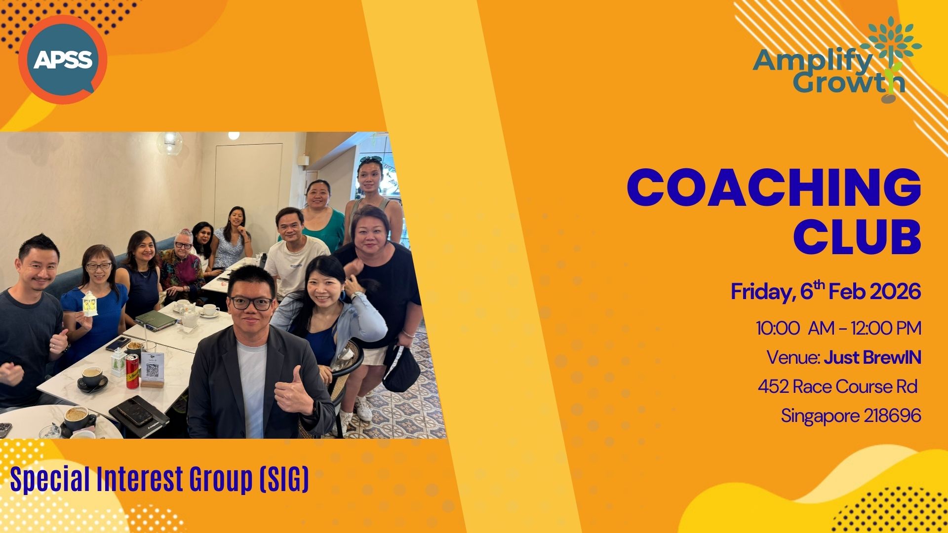 APSS SIG – Coaching Club Registration: https://my.asiaspeakers.org/event-6515656 + Add to Google Calendar + iCal / Outlook export Date Feb 06 2026 Expired! Time 10:00 am - 12:00 pm More Info Read More Location Just BrewIN 452 Race Course Rd, Singapore 218696 Share this event