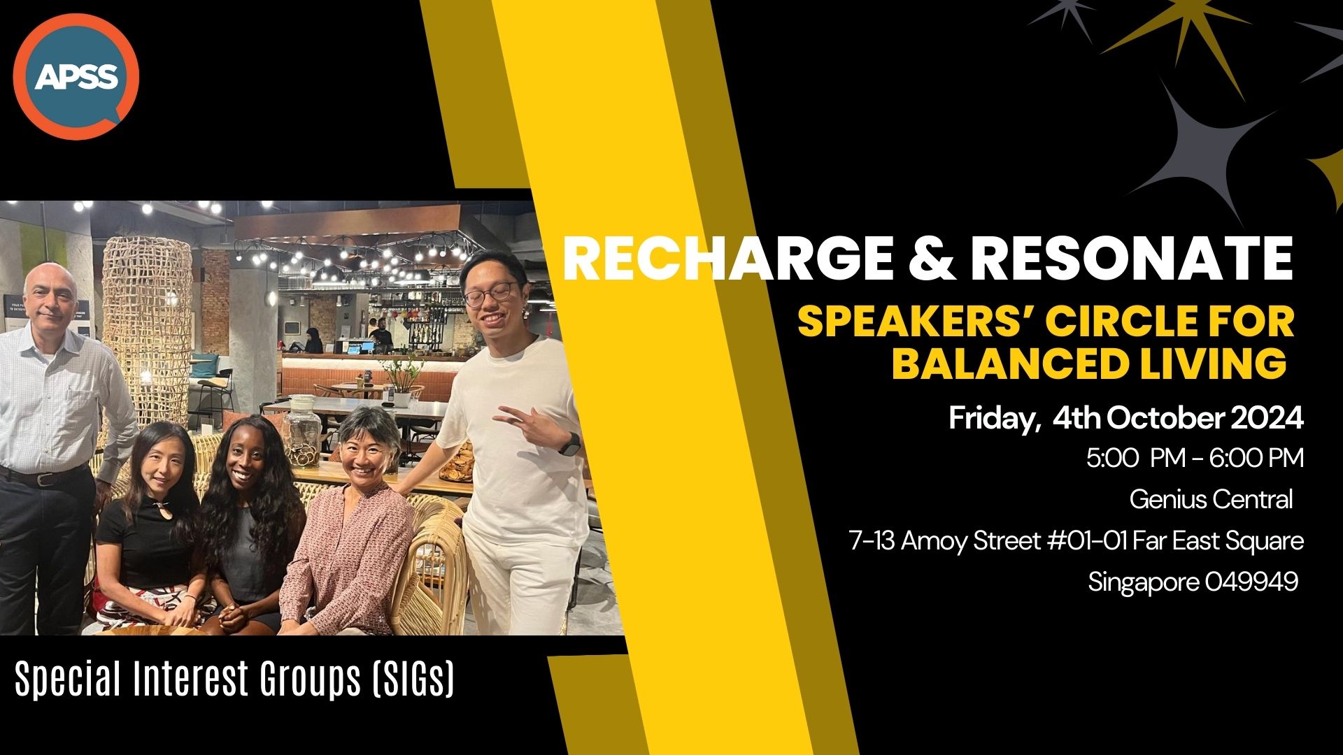 APSS SIG – Recharge & Resonate: Speakers’ Circle for Balanced Living + Add to Google Calendar + iCal / Outlook export Date Oct 04 2024 Expired! Time 5:00 pm - 6:00 pm Location Genius Central 7-13 Amoy Street #01-01 Far East Square, Singapore 049949 Share this event